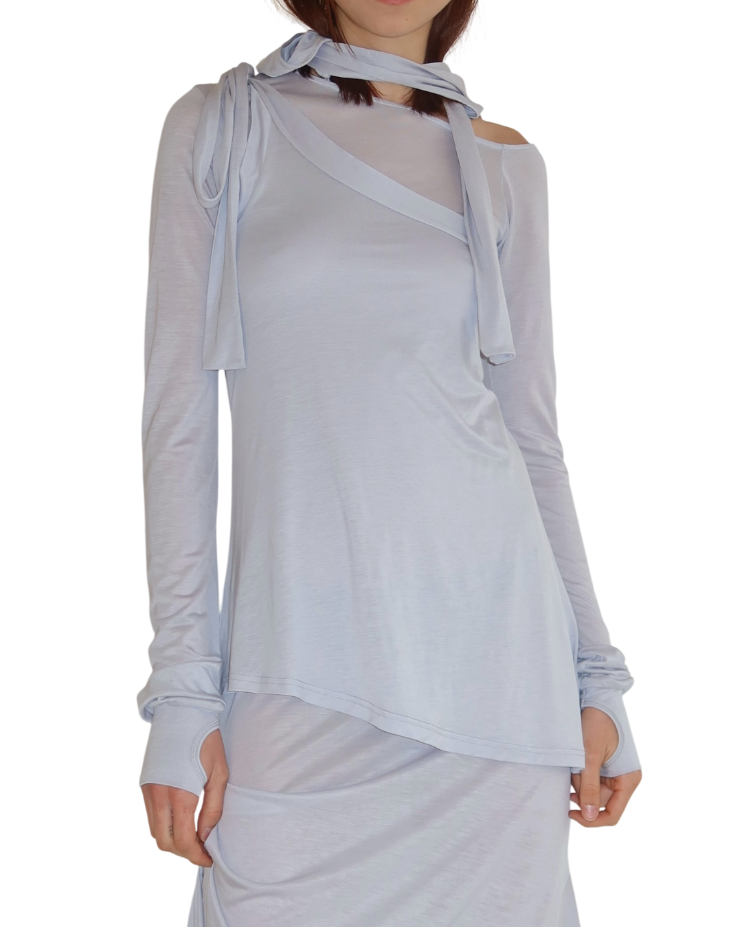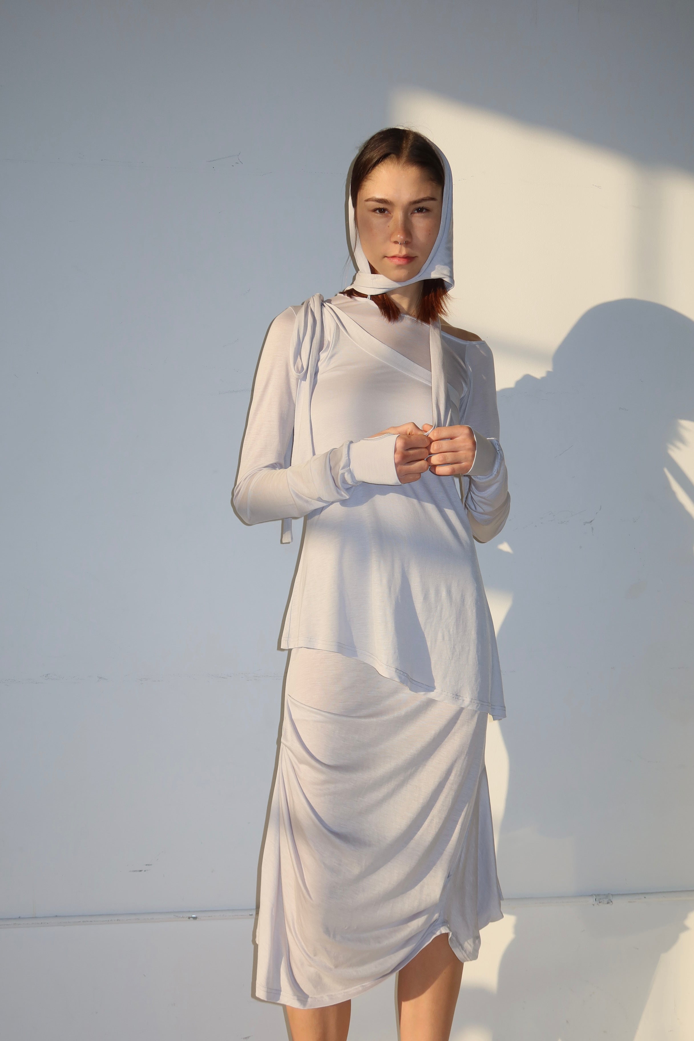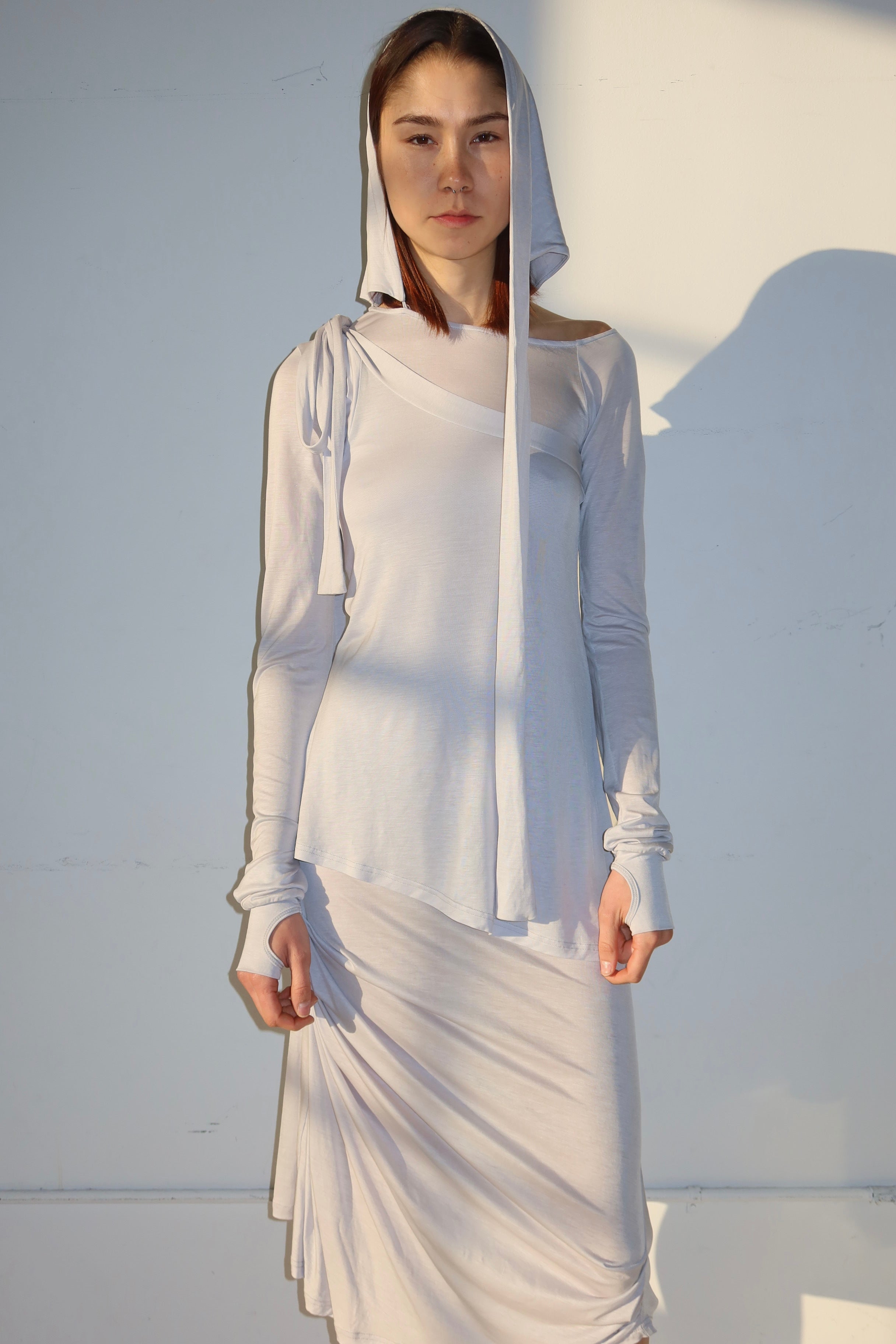 our buttery soft layered jersey pieces in our most daring style yet - a mid length asymmetrical layered dress with a detachable hood and thumb hole sleeves. Perfect for the girl on the go who needs to stand out ~ ❤︎ ₊˚⊹♡